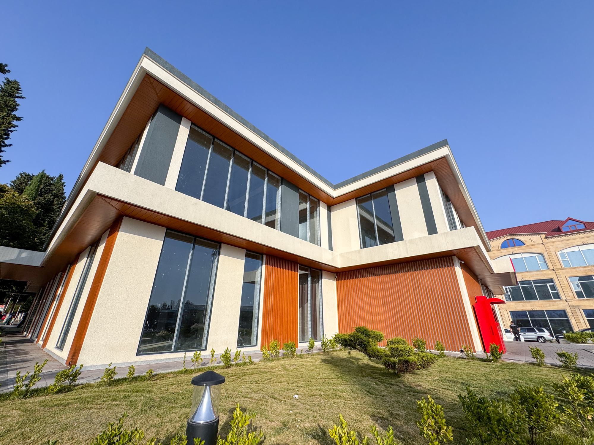 PMD Projects carried out the demolition of the existing building, engineering survey works (geology and geodesy), design, and construction-installation works for the Kapital Bank Zagatala project. The project features modern architecture with a minimalist and functional design.